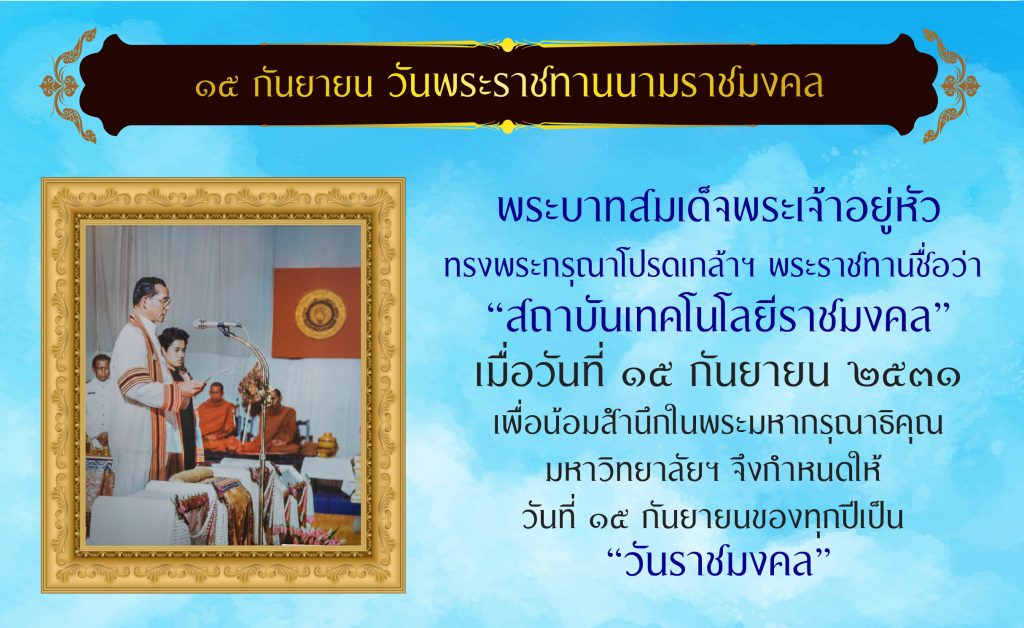 1988年9月15日,这是一次针对职校生的大爱。当普密蓬·阿杜德国王陛下慷慨地将该学院命名为“拉加曼加拉科技大学”。意思是“皇家理工学院”。这意味着拉加曼加拉科技大学的所有教职员工,包括讲师、公务员、官员和学生,都受到国王的祝福。